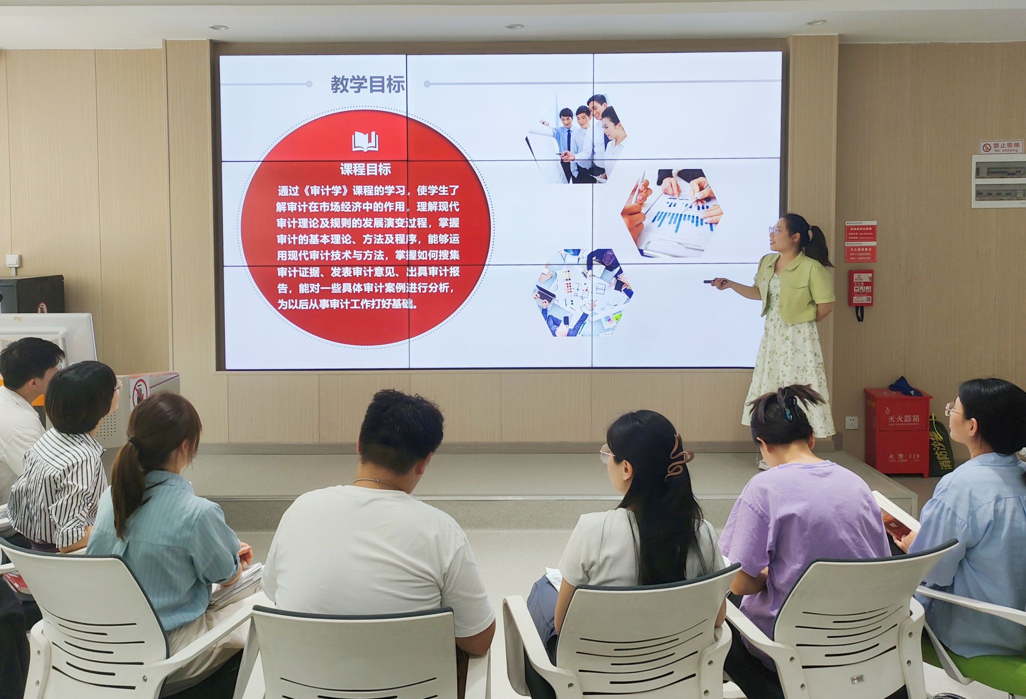 在教学方法研讨会上,教师们积极分享各自的教学经验与创新教学方法。青年教师王碧瑶老师以《审计学》课程为主体,从课程目标、课程主体框架以及重难点把握等三个方面进行了说课,分享通过案例分析和信息化教学手段加深学生对知识点理解的重要性。