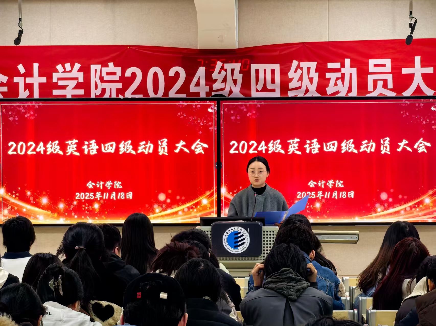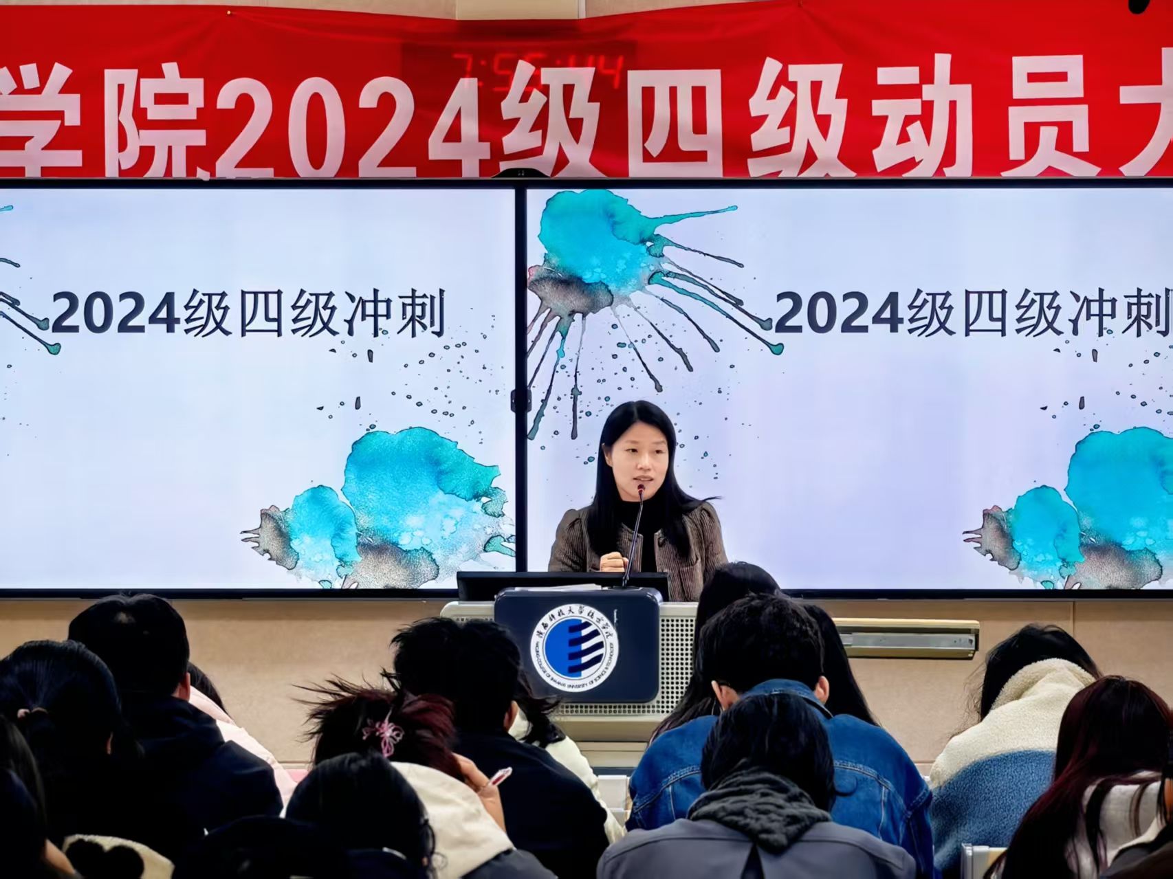 为激发2024级学子英语四级备考动力,构建“师生同心、协同冲刺”的备考格局,11月18日上午,437ccm·必赢国际在教学楼101隆重召开2024级英语四级动员大会。学院副院长韩雅轩、教学秘书黄璐、2024级辅导员及学生参会,大会由学工秘书薛晓轩主持。
