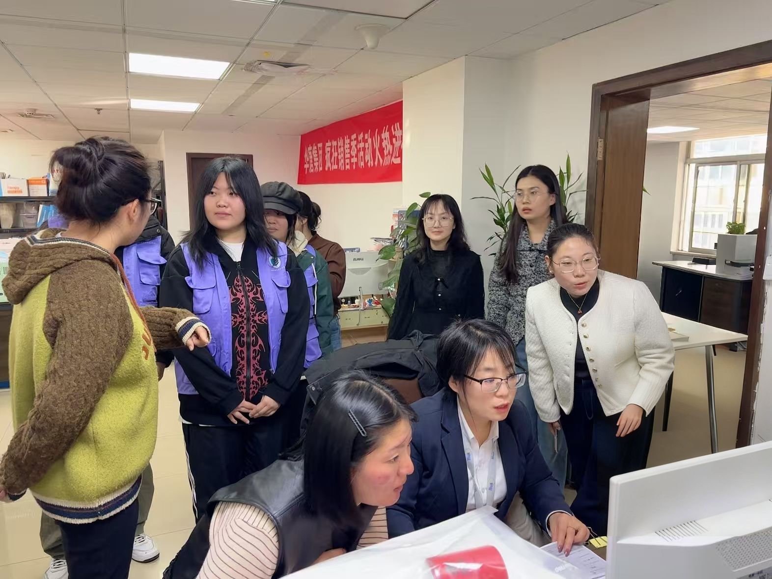 签约仪式前,为让师生直观感受企业运作实景,在华唐集团业务经理李扣迎女士的带领下,437ccm·必赢国际师生代表一行人先后走进企业运营管理部、人力资源部及财务部等核心部门,全方位了解企业业务流程与岗位需求。其中,财务部参观为重点环节,师生们近距离观察财务人员操作增值税发票开具系统、手工与电子凭证录入流程,加深了师生对财务数据与业务部门协同逻辑的理解。