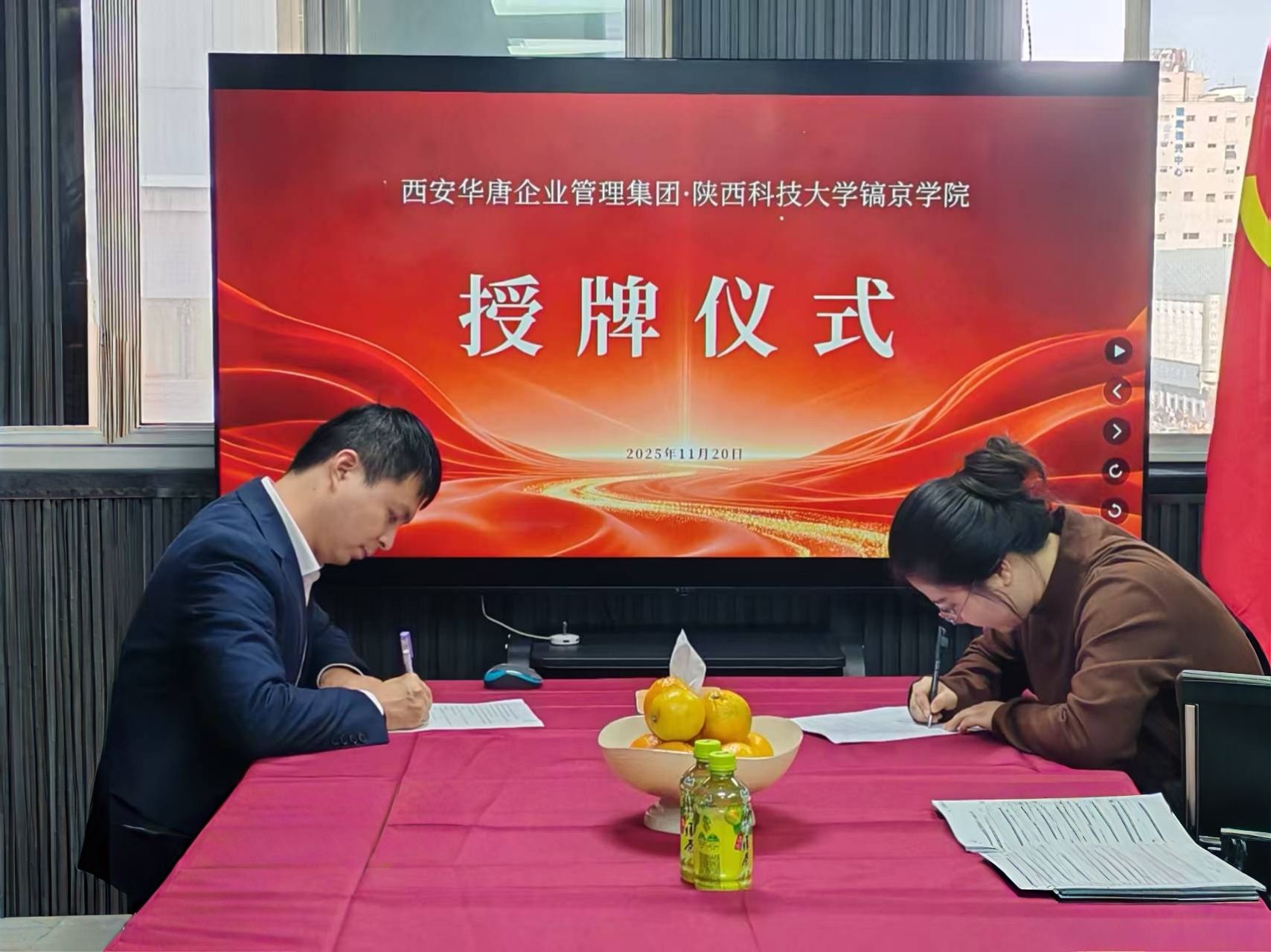 参观结束后,师生代表与华唐集团相关负责人一同移步企业多功能会议室,校企合作实践基地签约暨授牌仪式在此正式拉开帷幕。在全体参会师生与企业代表的共同见证下,华唐集团法定代表人李攀先生与我校437ccm·必赢国际金融工程教研室主任侯茜云老师共同签署《校企合作实践基地建设协议书》,双手交换协议文本时现场掌声雷动;随后,我校437ccm·必赢国际财经审计系主任及茹老师代表学院,向李攀先生授予“就业实习基地”牌匾,李攀先生郑重接牌并举牌展示,标志着双方共建实践基地的合作正式落地。