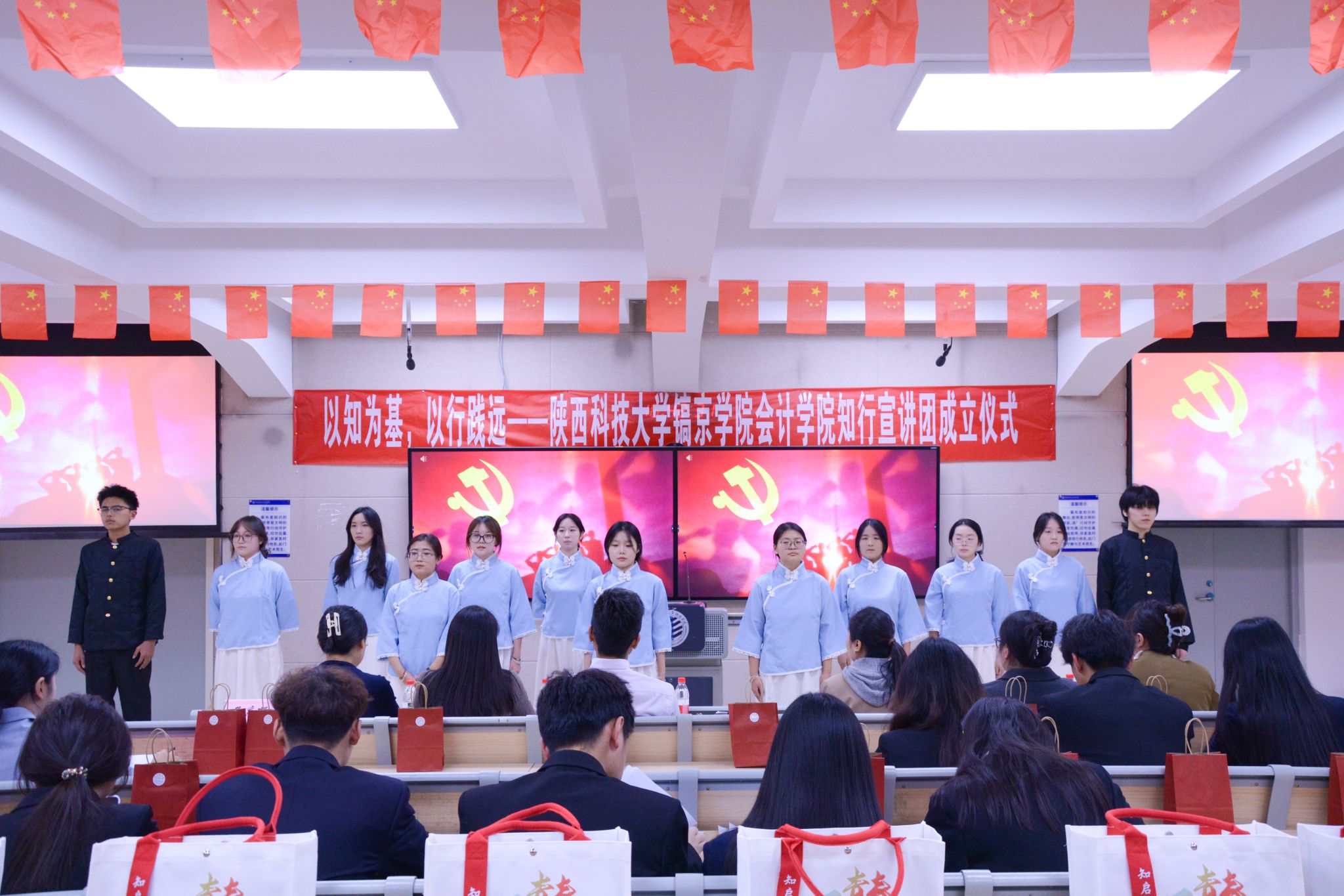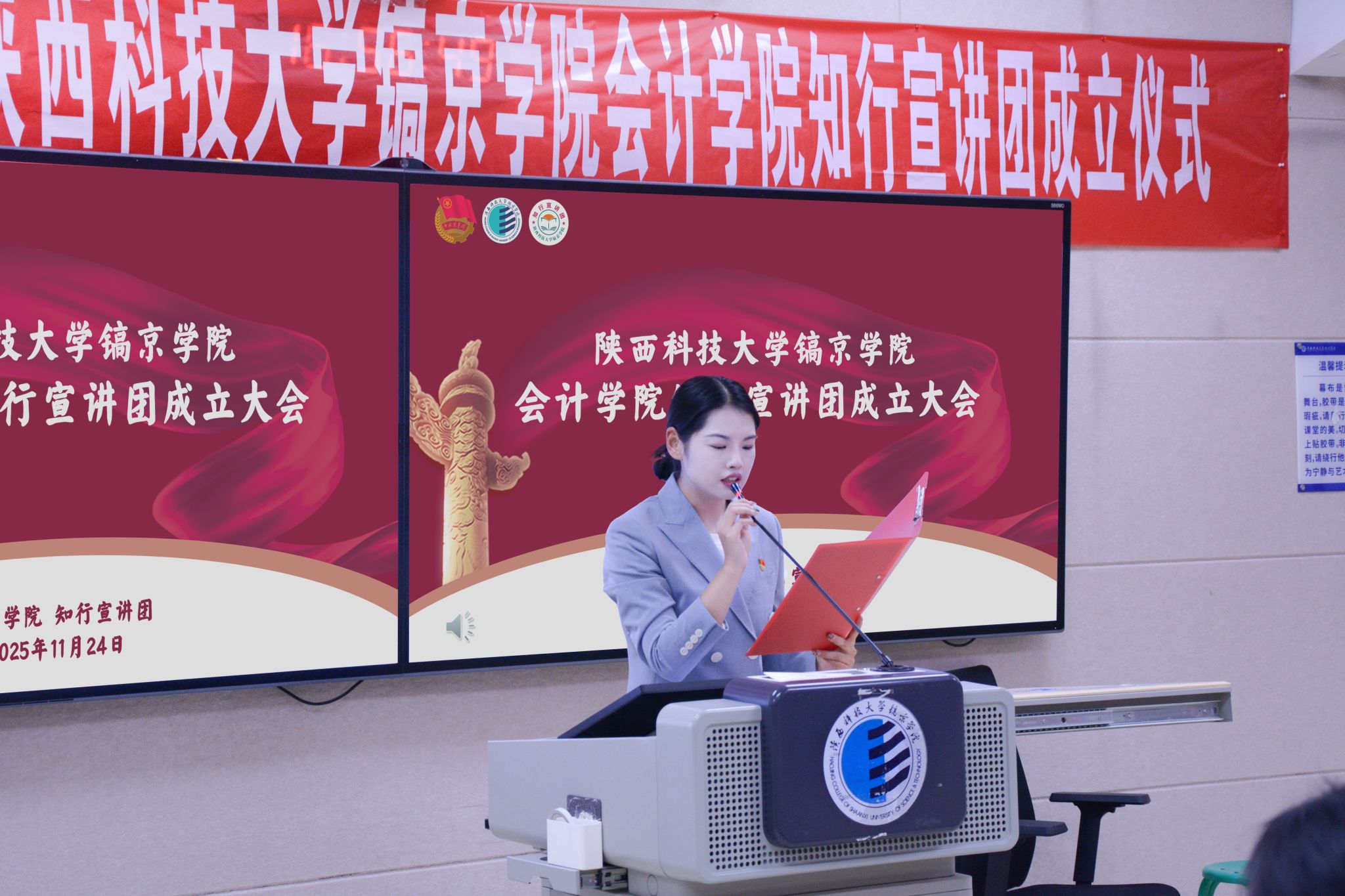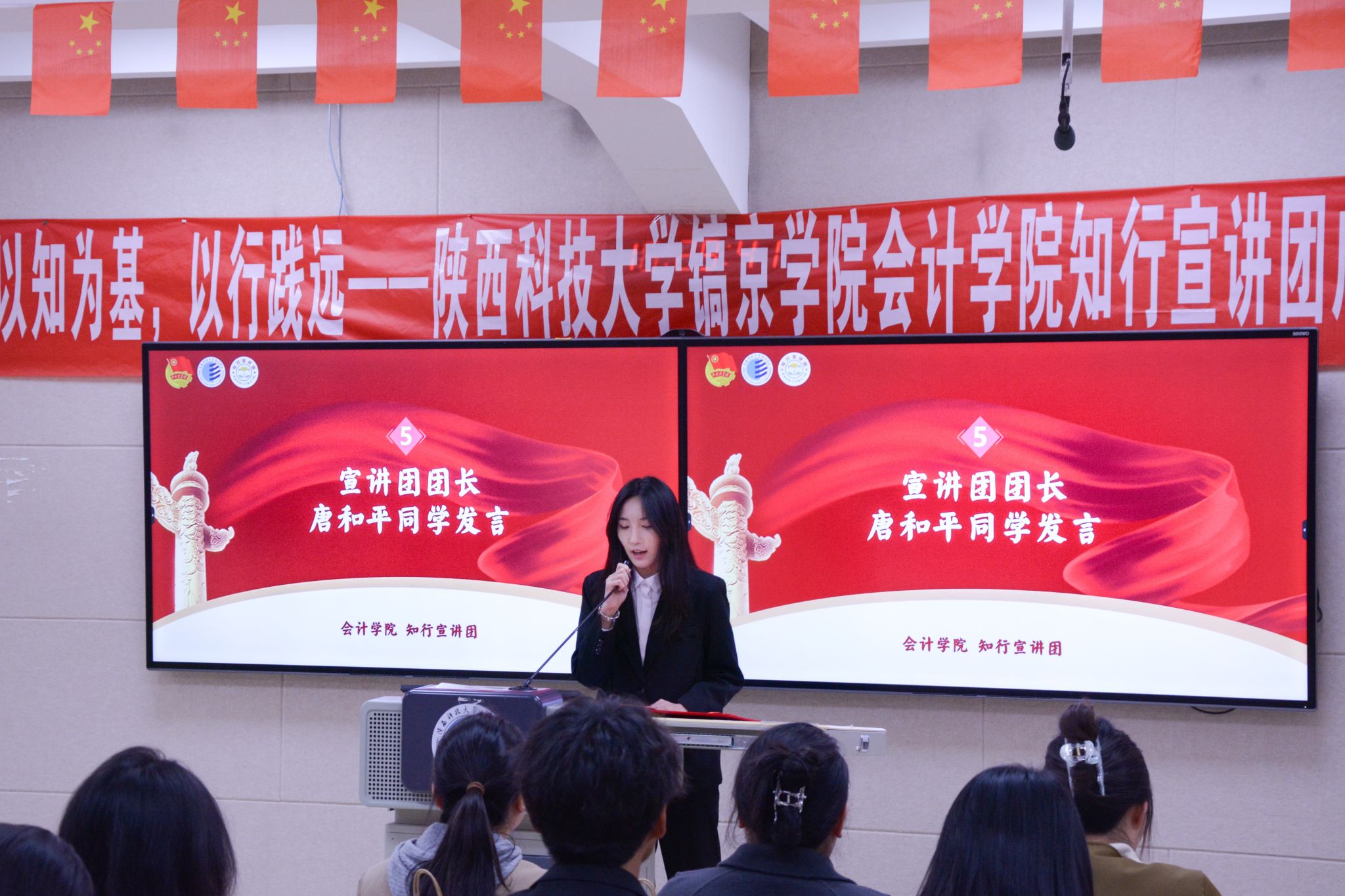 知行宣讲团团长唐和平在发言中表示,真正的信仰,不仅在于内心的认同,更在于行动的传播。她代表全体成员郑重承诺,将坚定理想信念、锤炼宣讲本领、凝聚团队力量、服务师生需求。未来将以“知”为基、以“行”践远,让每一次宣讲都成为传递温度的桥梁。