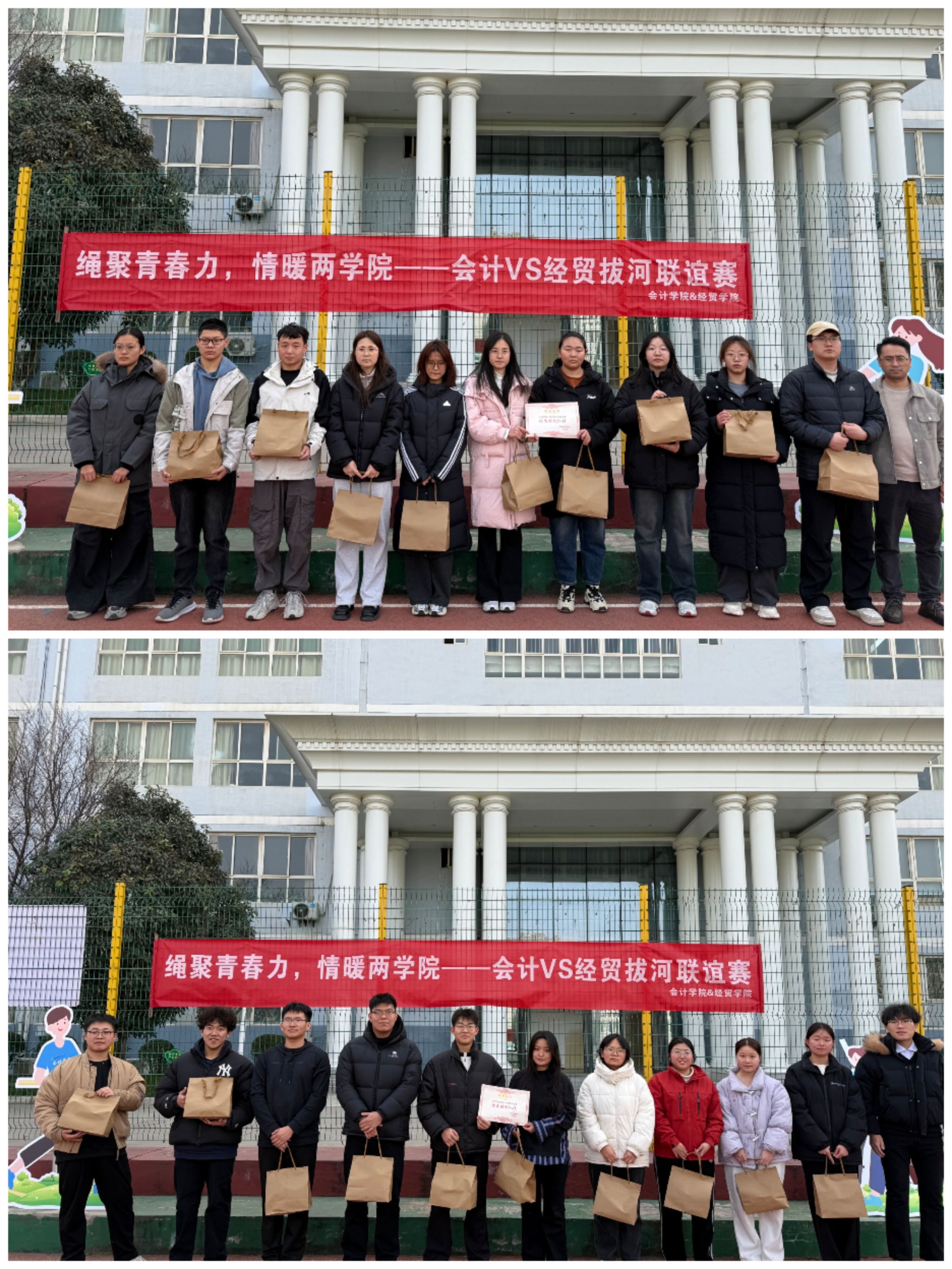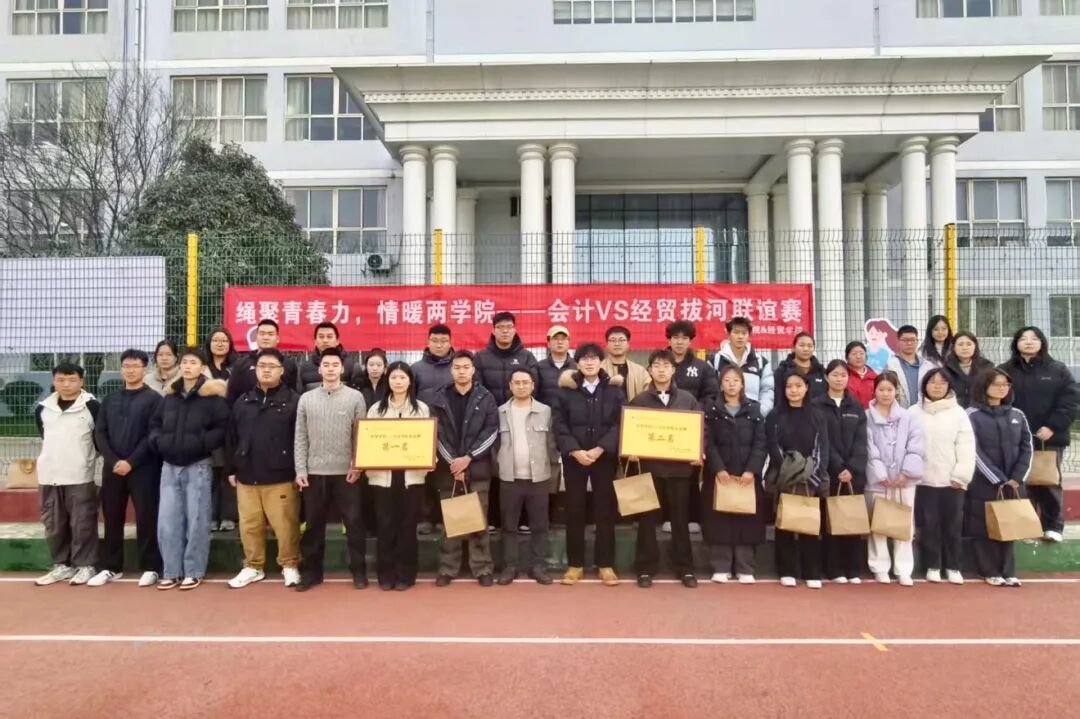 为弘扬团结协作的体育精神,增进跨院系交流合作,2025年12月23日午间,437ccm·必赢国际学生会联合经济贸易学院学生会在田径场共同举办了“经会联动·同绳共进”主题拔河比赛。经济贸易学院学工秘书闫树同、437ccm·必赢国际团总支书记张瀚宇等师生代表共同参与,通过竞技互动深化两个学院的友谊。